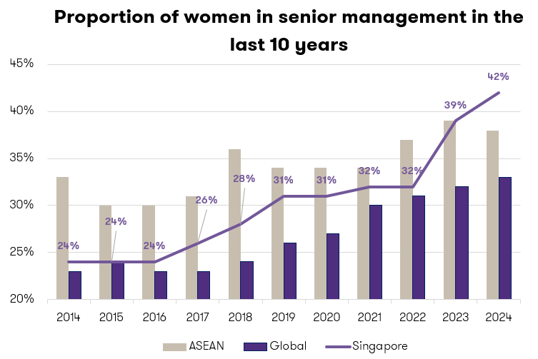 In this year's report, the overall proportion of women in senior leadership in Singapore's mid-market businesses has inched up slowly to 42%. Across ASEAN, we observed a marginal dip in the proportion of women in senior management to 38% in 2024.