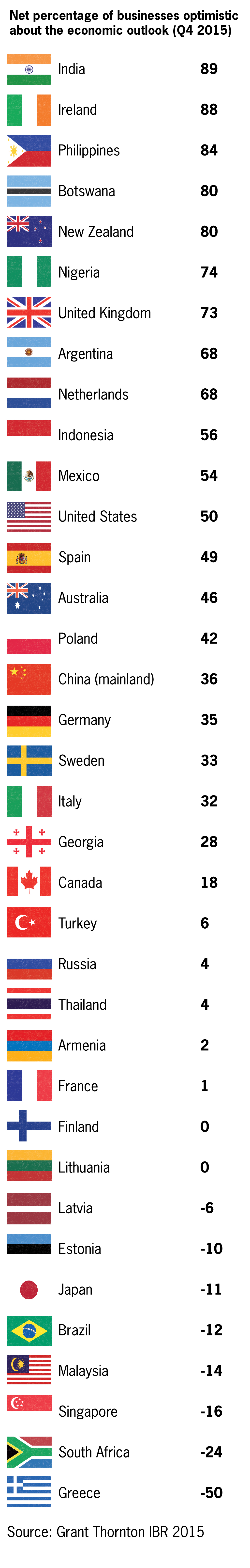 The IBR reveals that Ireland (88%), the UK (73%) and the Netherlands (68%) are the EU’s most optimistic economies at the start of 2016. UK firms in particular have reported big increases in their expectations for exports and profitability over the year ahead. Germany, the region’s biggest economy, remains optimistic but is down from 46% to 35% in Q4. This is partly due to profitability expectations falling from 50% six months ago to just 5% today.