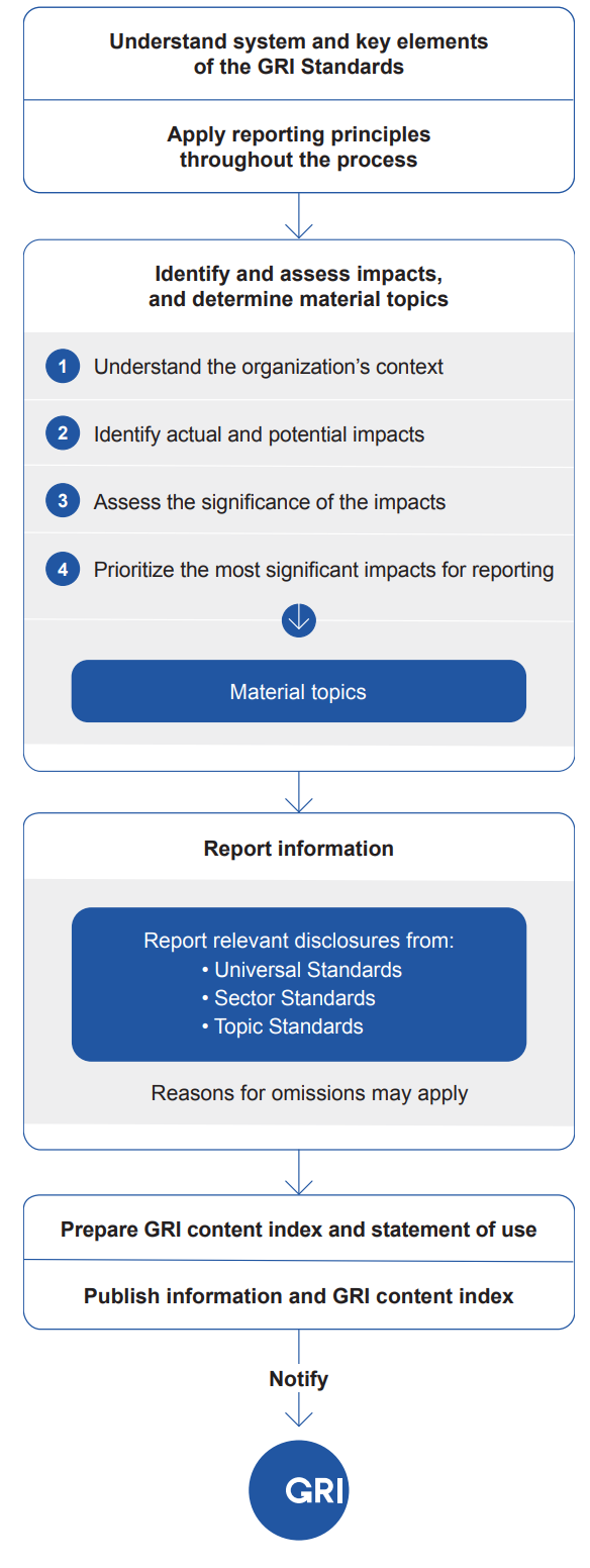 GRI 1 (concepts, principles, and reporting compliance requirements): The GRI Standards journey begins with GRI 1, laying the foundation by explaining key concepts, principles, and reporting compliance requirements. Identifying an organisation's impacts is an ongoing process, shaped by its unique context.