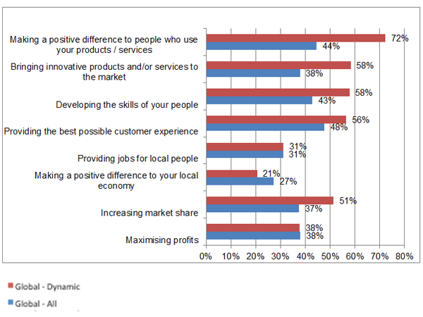 Recent findings from Grant Thornton’s International Business Report reveal that 70.5% of dynamic – or high-growth – companies across the world have a clearly defined non-financial purpose, versus 52.2% of all companies. Having a purpose is ‘very important’ to 44.1% of dynamic companies, compared to 40% of all companies.