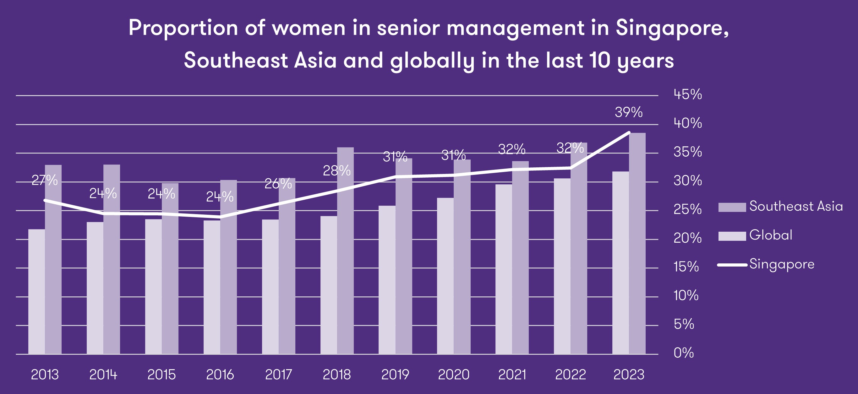 Progress on the overall proportion of women in senior leadership rises decisively in Singapore and in Southeast Asia, climbing ahead of other markets globally. In Singapore, the 2023 report found that the proportion of women in senior management spiked to 39%, based on a three-year moving average, a simple average of the current year and the last two years results.